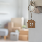 A house-shaped keychain hangs from a key in a door, with packed boxes and furniture visible in a softly focused room, suggesting moving into a new home.
